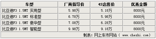 作為比亞迪汽車旗下的重點產(chǎn)品,比亞迪F3在今年又推出了智能白金版,新款車型增加了無鑰匙系統(tǒng)、智能娛樂通訊系統(tǒng)等高端配置,使這款自主品牌家用轎車的競爭力更加突出。網(wǎng)上車市網(wǎng)站了解到,雖然比亞迪F3智能白金版上市時間不長,但目前優(yōu)惠幅度有所提升,經(jīng)銷商處全系可給出8千的優(yōu)惠。詳情如下: