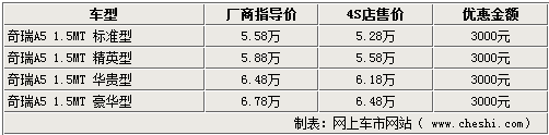 據(jù)奇瑞4S店銷售人員介紹,目前各店內(nèi)均主要銷售1.5升的A5車型,老款的A516已經(jīng)停產(chǎn),4S店都已經(jīng)沒有庫存車銷售,未來也不會再投產(chǎn)進行銷售。目前奇瑞A515精英型等車型在店里都有現(xiàn)車銷售,現(xiàn)在購A5全系均可享受3000元的優(yōu)惠。