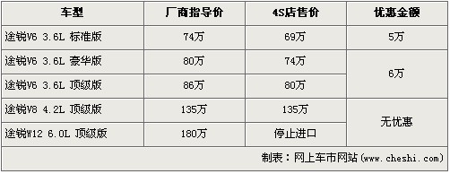 途銳是大眾首款引進(jìn)我國的SUV車型,在3.6L及4.2L率先上市后,大眾為了滿足消費(fèi)者的更大胃口,緊接著又推出了搭載12缸發(fā)動(dòng)機(jī)的6.0L車型。隨著大排量消費(fèi)稅的頒布,給9月份后入關(guān)的大排量車型帶來了一次不小的沖擊,令大排量汽車價(jià)格都上調(diào)了不少。近日據(jù)網(wǎng)上車市價(jià)格系統(tǒng)監(jiān)測顯示,大眾途銳的6.0L車型已經(jīng)停止進(jìn)口,并且購買目前購車可以得到最高6萬元的優(yōu)惠,具體詳情請看下表:
