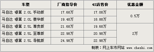 據(jù)一汽馬自達4S店銷售人員介紹,馬自達6睿翼目前全系車型最高可以優(yōu)惠現(xiàn)金2萬元,2.5排量三款車優(yōu)惠后最低僅售19.68萬,其中2.0排量車型目前也可以優(yōu)惠現(xiàn)金5千元。本月底經(jīng)銷店內(nèi)有黑色、銀色、紫色等現(xiàn)車供應(yīng)。