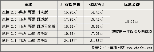據(jù)北京現(xiàn)代北京地區(qū)4S店銷售人員介紹,途勝車型優(yōu)惠現(xiàn)金2萬元或贈送購置稅及全年保險(xiǎn),兩 項(xiàng)優(yōu)惠只能選擇其一。目前店內(nèi)現(xiàn)車供應(yīng)主要為銀色、黑色為主,四驅(qū)部分車型需要預(yù)訂,訂金5千元,一周左右時(shí)間可以提車。如消費(fèi)者有意購買,到店詳談會有 更優(yōu)惠的價(jià)格。北京地區(qū)各4S店由于訂單不同,各店銷售的現(xiàn)車顏色有所不同。