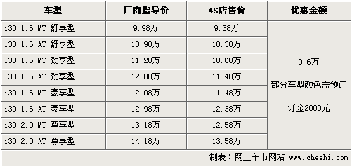 據(jù)北京現(xiàn)代4S店銷售人員介紹,目前現(xiàn)代i30現(xiàn)金優(yōu)惠6000元,店內(nèi)有少量1.6舒享型及1.6豪享型現(xiàn)車,顏色以紅色、黑色、銀色為主。其余車型預(yù)訂最快1周可提車,訂金為2000元。關(guān)注此車的朋友可致電4S店詳詢,北京地區(qū)各4S店由于訂單不同,各店銷售的現(xiàn)車顏色有所不同。