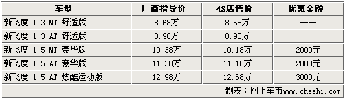 廣汽本田新飛度一直以時尚的外觀,經(jīng)濟(jì)的油耗和精細(xì)的內(nèi)飾做工贏得了不少年輕都市白領(lǐng)的認(rèn)可。根據(jù)網(wǎng)上車市價格監(jiān)測系統(tǒng)顯示,目前新飛度最高優(yōu)惠3千元左右,1.3L車型需預(yù)訂。具體車型行情如下: