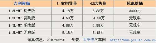 近日,筆者從北京吉利4S店了解到,目前該車的優(yōu)惠幅度比較穩(wěn)定,手動擋車型功夫版外均有4000元的現(xiàn)金優(yōu)惠,但現(xiàn)車方面僅有功夫版車型有少量現(xiàn)車,有意向購買的消費者可要抓緊了。詳情請見下表: