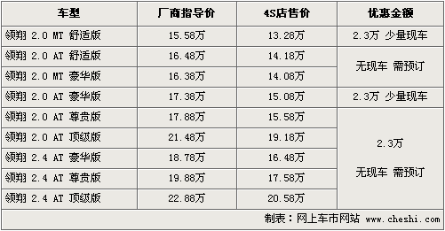 北京現(xiàn)代索納塔領(lǐng)翔于08年底正式上市銷(xiāo)售,為了提高領(lǐng)翔在同級(jí)別車(chē)型中的競(jìng)爭(zhēng)力,在原有車(chē)型基礎(chǔ)上,領(lǐng)翔又新增了兩款車(chē),并提高了多款車(chē)型的配置,提高了整車(chē)性?xún)r(jià)比。根據(jù)網(wǎng)上車(chē)市價(jià)格監(jiān)測(cè)系統(tǒng)顯示,目前領(lǐng)翔全系優(yōu)惠進(jìn)一步增加,最高可優(yōu)惠現(xiàn)金2.3萬(wàn)元。具體行情如下: