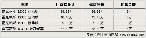 據(jù)4S店銷售人員介紹,目前雷克薩斯IS300供應的車型均為2010款,新款車型比老款增加了諸多配置,性價比更高。同時現(xiàn)車方面,入門級和炫動版車型的現(xiàn)金優(yōu)惠為3萬元,豪華版暫時沒有現(xiàn)車,需要預訂。硬頂敞篷跑車IS300C的優(yōu)惠幅度則達到了5萬元。