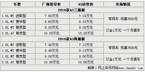 奇瑞A3是奇瑞汽車所生產(chǎn)的一款成功轉(zhuǎn)型的產(chǎn)品,自上市以來(lái)激起了廣大消費(fèi)者對(duì)自主品牌追捧的新浪潮。奇瑞A3外觀時(shí)尚、運(yùn)動(dòng),迎合時(shí)代潮流,超高的性價(jià)比造就了奇瑞A3的銷量直線上升。2010款奇瑞A3的表現(xiàn)也不遜色于老款產(chǎn)品,增加了更多時(shí)尚元素和實(shí)用配置。網(wǎng)上車市走訪了北京地區(qū)奇瑞4S店,得到了2010款奇瑞A3最新的市場(chǎng)消息,具體信息請(qǐng)參考下表: