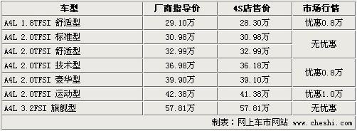 據(jù)北京一汽奧迪經(jīng)銷店銷售人員介紹:目前A4L全系現(xiàn)車比較齊全,除1.8TFSI及3.2L車型現(xiàn)車較少以外,其余車款均有現(xiàn)車,F(xiàn)車顏色主要有銀色、灰色、紅色等,如預(yù)定其他顏色車型需預(yù)定,預(yù)定最少等20天,最長(zhǎng)等待1個(gè)半月。1.8TFSI及3.2L車型等待時(shí)間較長(zhǎng),需等3個(gè)月時(shí)間。優(yōu)惠方面,目前全系最高優(yōu)惠1萬元,其余車型均有8000元左右的優(yōu)惠幅度,F(xiàn)購車取消了加價(jià),并還有一定幅度的優(yōu)惠,此時(shí)購車比較劃算,喜歡的消費(fèi)者請(qǐng)及時(shí)與店內(nèi)聯(lián)系。