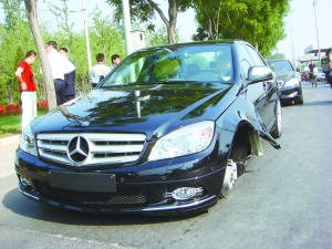 昨天下午2時30分許,來自內(nèi)蒙古赤峰市的李先生,在清河附近的博瑞祥馳汽車銷售服務(wù)中心新買了一輛奔馳轎車。沒想到新買的“大奔”剛上路不到1公里,左前輪就飛了出去,好在當(dāng)時的車速不快,李先生幸未受傷。