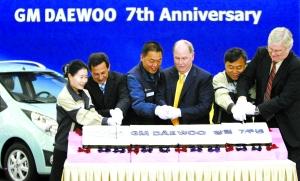 10月15日,韓國仁川,通用大宇慶祝7歲生日。通用汽車首席執(zhí)行官韓德勝(右三)、通用汽車公司執(zhí)行副總裁羅瑞立(右一)與通用大宇領(lǐng)導(dǎo)層切蛋糕。在當(dāng)日的新聞發(fā)布會(huì)上,韓德勝稱,出售歐寶的談判仍在繼續(xù)進(jìn)行。2001年10月17日,通用汽車與其合作伙伴鈴木汽車及上汽集團(tuán),共同收購了大宇汽車66.7%的股份。