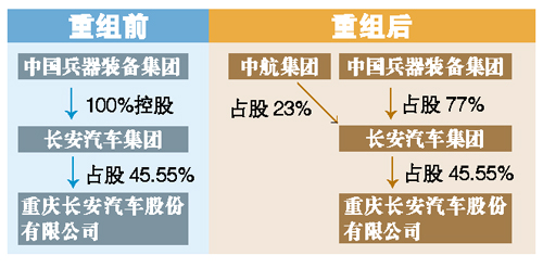 與此前“中航將汽車資產(chǎn)無償劃撥給長(zhǎng)安汽車集團(tuán)”的報(bào)道不同, 根據(jù)重組方案,中航工業(yè)以其持有的昌河汽車、哈飛汽車、東安動(dòng)力、昌河鈴木、東安三菱的股權(quán),劃撥給兵裝集團(tuán)旗下的中國(guó)長(zhǎng)安汽車集團(tuán);兵裝集團(tuán)將旗下中國(guó)長(zhǎng)安汽車集團(tuán)23%的股權(quán)劃撥給中航工業(yè)。兩集團(tuán)重組成立新的中國(guó)長(zhǎng)安汽車集團(tuán)股份有限公司,兵裝集團(tuán)持股77%、中航工業(yè)持股23%。