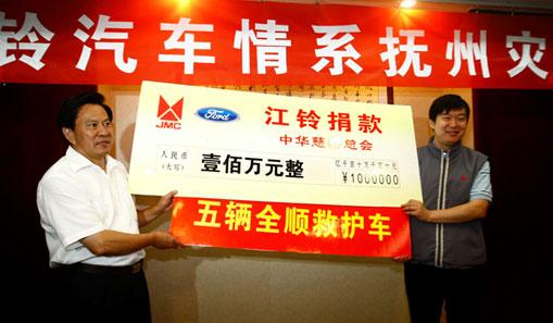 江鈴股份公關(guān)及法務(wù)部部長丁朝陽代表江鈴汽車股份有限公司將5輛福特全順救護車鑰匙和100萬元人民幣交給撫州市慈善總會代表撫州市市委常委、常務(wù)副市長謝發(fā)明手中