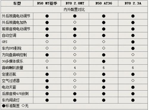 通過此項的對比,可以發(fā)現(xiàn)兩款兄弟車型在外觀以及內部的絕大多數(shù)配置均極為近似,僅僅是在高配車型之上有了一些不同的豪華系統(tǒng),如B70 2.3AT豪華車型上的GPS以及DVD系統(tǒng),還有B50 AT3G版之上的多媒體娛樂系統(tǒng)等等。而B50全息均配備了定速巡航系統(tǒng),也是新車的一大亮點!