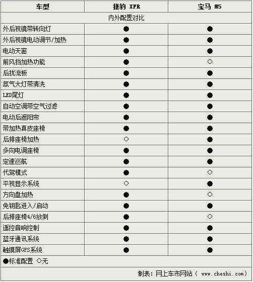 既然提到兩款車均為豪華車型,舒適配置當(dāng)然也是不能被忽視的一面。捷豹XFR則在此方面表現(xiàn)的可圈可點(diǎn),多項(xiàng)高端配置均一一齊備。而價(jià)格相差3萬的寶馬M5在此方面則略顯遜色,看來寶馬車型更加在乎駕駛樂趣。但從此方面則證明了捷豹XFR為有機(jī)會(huì)乘坐其中的駕乘者想的更多,不僅滿足了駕駛與運(yùn)動(dòng)的樂趣,也可直接享受更多的舒適及便利。