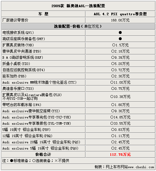 作為奧迪A8L中的旗艦車型,09款奧迪A8L 6.0 W12quattro最高售價接近300萬元。但就是這樣一輛頂級豪車,在配置方面也沒有完全“頂級”,仍然有多項選裝配置可供選擇。如選擇全部的選裝配置,09款奧迪A8L 6.0 W12quattro的最高的售價將接近350萬元!