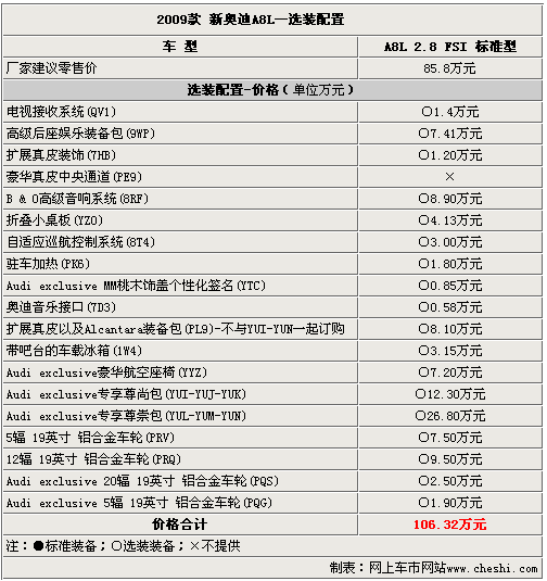 以上的選裝配置需要在預訂車輛前選擇好,經銷商會根據(jù)客戶的訂單向廠家發(fā)送配置代碼。09款奧迪A8L的選裝配置十分豐富,完全可以滿足對配置有需求消費者的“苛刻”要求。當然,這些配置也需要不菲的金錢才可以擁有,究竟哪些配置適合有品位懂得享受的您呢?