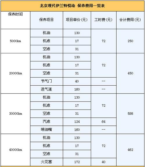 4.保養(yǎng)費(fèi):悅動(dòng)的首保為5000km,以后每次的保養(yǎng)間隔為5000km。保修政策為2年/6萬(wàn)公里保修(以先到為準(zhǔn))。第二次的10000km保養(yǎng)和首保內(nèi)容相同。那么如果一年行駛2萬(wàn)km,悅動(dòng)一年要做四次保養(yǎng)。由下表可知其除了第一年,以后每年的保養(yǎng)費(fèi)用1500元。