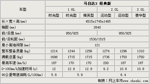 馬3經(jīng)典版全系車型的車身尺寸達到了4515 X 1745 X 1465mm;雖然這款車采用了更加運動的前臉,但是車身尺寸較老款車型并沒有變化,而且這款車的離地間隙為121mm,比較適應(yīng)國內(nèi)的復(fù)雜路況。由于排量的不同,這六款車的加速時間也有所區(qū)別,其中1.6L自動擋車型的加速時間為12.8秒,2.0L手擋車型的加速時間為9.2秒。