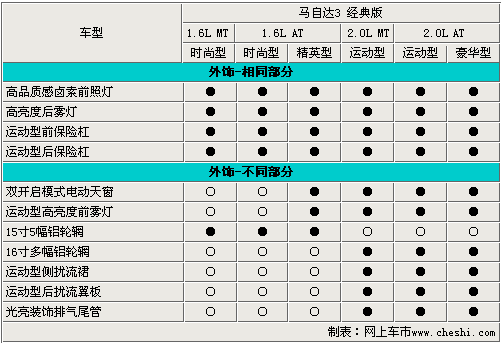 廠家為了區(qū)分各車型之間的差異,往往體現(xiàn)在車身外形設(shè)計上。馬3經(jīng)典版的2個系列車型在外觀上的差別也比較明顯,其中2.0L車型配備車身運動包圍、運動型后擾流板、光亮裝飾排氣管等運動套件。 值得一提的是,除兩款低配車型以外,其余四款車型均配備了雙開啟電動天窗和高亮度前霧燈,這兩項配置可以說是新馬3經(jīng)典版增配中的一個亮點。
