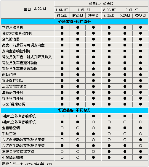 在舒適性配置方面,這六款車同樣是比較齊全。帶MP3功能的單碟CD、空氣濾清器、方向盤音響控制、車窗延時功能等配置都可以在這6款車上找到。不過高配車型配備了6喇叭音響系統(tǒng)、全自動空調(diào)和引擎隔音膜等舒適性配置。