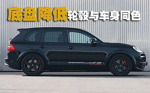 Gemballa版保時捷—卡宴GT500采用全黑色的車身色調,22英寸直徑的輕量化輪轂輪轂也噴涂成了與車身同色,力求統(tǒng)一的色彩風格。換裝了新設計前后保險杠以及后尾翼與側裙。