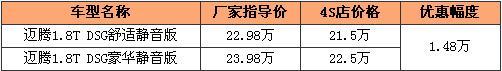 近日,愛卡汽車網(wǎng)從北京捷亞泰一汽大眾4S店得到消息,邁騰1.8TSI DSG的靜音版車型現(xiàn)在可以優(yōu)惠1.48萬,最低售21.5萬。