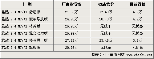 作為一款中級商務車,新君越在配置以及空間有一定的特點,它裝備了強大的智能中文語音導航系統(tǒng),三音源分控式DVD劇院系統(tǒng)以及方向盤控制的車載藍牙電話系統(tǒng)充分考慮到了商務人士的乘坐需要。而即將上市的新款君越在外觀上的全系升級又讓消費者重新認識到君越的獨特魅力。目前,筆者從別克經銷商處了解,新款君越已經開始接受預訂,老款優(yōu)惠增加,具體行情如下: