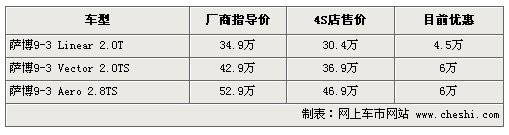 據(jù)4S店銷售人員介紹:目前薩博9-3現(xiàn)車較充足,最高優(yōu)惠可達(dá)6萬元,標(biāo)準(zhǔn)型薩博9-3目前優(yōu)惠4.5萬。如需訂購顏色較少的車,等待時間在1-2周左右。