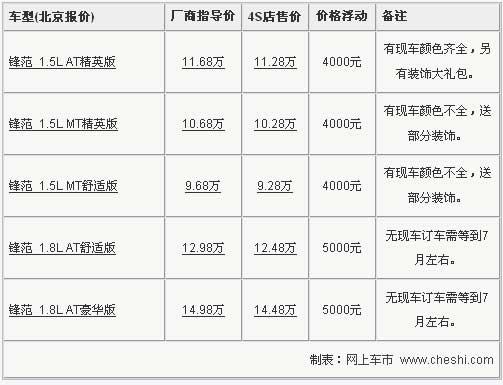 據(jù)廣汽本田4S店銷(xiāo)售人員介紹,目前鋒范有3千元-5千元不等的優(yōu)惠,另外近期購(gòu)車(chē)還將贈(zèng)送部分裝飾,包括腳墊、座套等可供消費(fèi)者選擇,F(xiàn)車(chē)方面主要以1.5L車(chē)型為主,部分顏色及1.8L車(chē)型需要提前預(yù)訂,預(yù)訂訂金為1000元,7月左右可以提到現(xiàn)車(chē)。北京地區(qū)各4S店由于訂單不同,各店銷(xiāo)售的現(xiàn)車(chē)顏色有所不同。