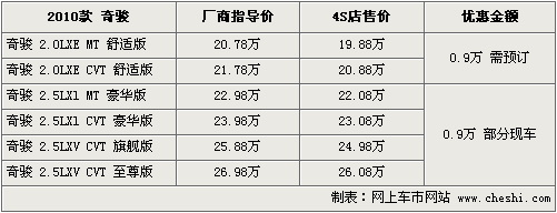奇駿2010款新車在10月28日正式上市銷售,新款在外觀、配置等方面進(jìn)行了一些列升級(jí),但是價(jià)格并沒有做出任何調(diào)整。根據(jù)網(wǎng)上車市價(jià)格監(jiān)測(cè)顯示,目前購(gòu)買2010款奇駿可享受9000元的現(xiàn)金優(yōu)惠,但低配車型現(xiàn)車緊張需預(yù)訂,具體參考如下: