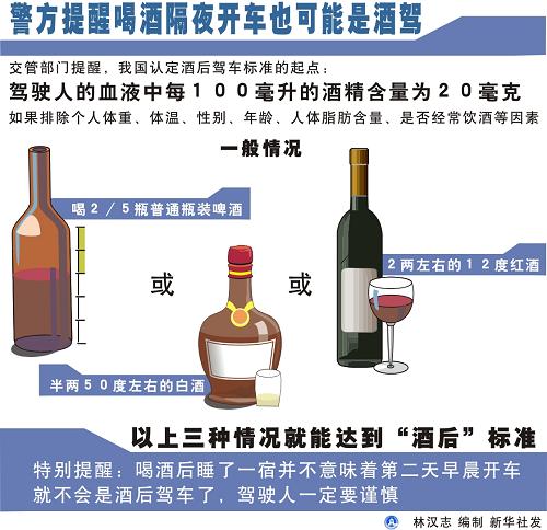 交管部門提醒,我國認(rèn)定酒后駕車標(biāo)準(zhǔn)的起點是,駕駛?cè)说难褐忻?00毫升的酒精含量為20毫克。從天津市以往查處情況看,如果排除個人體重、體溫、性別、年齡、人體脂肪含量、是否經(jīng)常飲酒等因素,一般喝2/5瓶普通瓶裝啤酒,或半兩50度左右的白酒,或2兩左右的12度紅酒,就能達(dá)到“酒后”標(biāo)準(zhǔn)。特別是,喝酒后睡了一宿并不意味著第二天早晨開車就不會是酒后駕車了。(記者劉元旭)