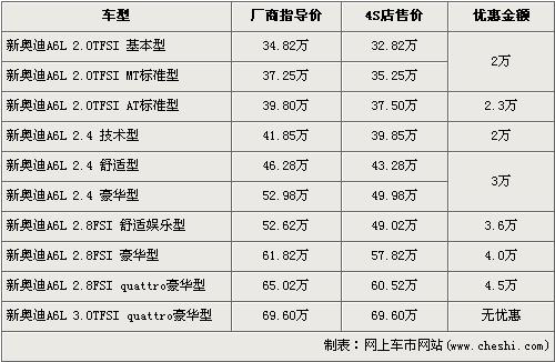在奧迪家族中,A6L是非常重要的一款商務車型,新款奧迪A6L通過外觀和安全等方面的改款升級,在同級別車型中擁有了更高的性價比,入門級車型價格更能夠比拼寶馬5系等對手。根據(jù)網(wǎng)上車市價格監(jiān)測系統(tǒng)顯示,目前A6L最高優(yōu)惠達到了4.5萬元,具體行情如下: