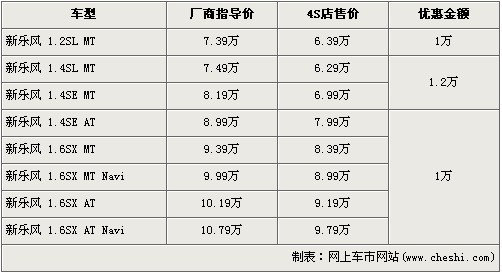 新樂風(fēng)是雪佛蘭旗下的三廂入門級家用車銷售主力,但由于上市多年,消費(fèi)者對于它也產(chǎn)生了審美疲勞。在今年的5月份,帶有家族新特征的小改款新樂風(fēng)來到世人眼前,外觀的改進(jìn)讓此車動感不少。近日據(jù)網(wǎng)上車市價格系統(tǒng)檢測顯示,新樂風(fēng)出現(xiàn)了最高1.2萬元的優(yōu)惠,具體價格詳情請看下表: