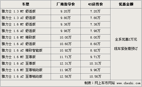 雅力士在歐洲是一款非常受歡迎的A0級(jí)小車,但在08年進(jìn)入國(guó)內(nèi)銷售后,其銷量并不樂(lè)觀,但是從這款車的配置、安全性方面,仍然是一款值得購(gòu)買(mǎi)的小車。根據(jù)網(wǎng)上車市價(jià)格監(jiān)測(cè)系統(tǒng)顯示,目前雅力士銷售比較火爆,現(xiàn)車緊缺,近期購(gòu)買(mǎi)雅力士全系車型可以優(yōu)惠2萬(wàn)元。具體行情如下:
