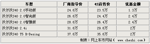 據(jù)4S店銷售人員介紹:目前S40系列車型較之前優(yōu)惠幅度有所變動,最高降幅達2.4萬元。2.0升兩款自動版車型優(yōu)惠2.4萬元現(xiàn)金,S40 T5渦輪增壓版車型及2.4i車型優(yōu)惠2萬元。二手動版車型僅可優(yōu)惠1.3萬元,且店內(nèi)車型不全。到店詳談還有更多優(yōu)惠余地。店內(nèi)購車可送腳墊,除此之外無其他裝飾贈送。顏色方面,銀色、紅色車型現(xiàn)車相對較多,如預定其他顏色車型,需等待半個月至一個月時間,如著急用車的消費者請安排好提車時間。