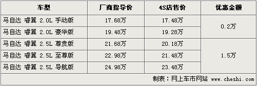 睿翼是一汽馬自達(dá)旗下的主力車型,憑借著運(yùn)動(dòng)性的流線型外觀和精準(zhǔn)的操控性贏得了消費(fèi)者的青睞。目前一汽馬自達(dá)睿翼共五款車型分別覆蓋了2.0和2.5排量。根據(jù)網(wǎng)上車市價(jià)格監(jiān)測(cè)系統(tǒng)顯示:睿翼相比節(jié)前優(yōu)惠有所減少,近期最高優(yōu)惠1.5萬元。具體車型行情如下: