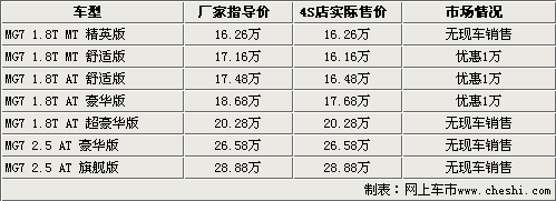 據(jù)名爵4S店銷售人員介紹,名爵MG7只有1.8T車型是店內(nèi)較為齊全的車型,2.5排量車型均需要提前預(yù)定,F(xiàn)在購買名爵MG7 1.8T車型在店內(nèi)可直接優(yōu)惠1萬元,比前一段時(shí)間的優(yōu)惠幅度有所提高,F(xiàn)在購車除了可以享受到現(xiàn)金優(yōu)惠外,還可以享受到商家贈(zèng)送的價(jià)值7000元的裝飾禮包。北京地區(qū)各4S店由于訂單不同,各店銷售的現(xiàn)車顏色有所不同,消費(fèi)者在購買前可以多去幾家4S店。