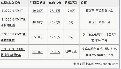 雷克薩斯IS300在原來車型基礎上,新推出了2010款的增配版車型,三款車增加了智能副駕駛系統(tǒng)等重量級的高端配置,但是售價并沒有明顯的變化。目前根據(jù)網(wǎng)上車市價格監(jiān)測系統(tǒng)顯示,IS300最高可優(yōu)惠現(xiàn)金3萬元,部分現(xiàn)車供應。具體行情如下:
