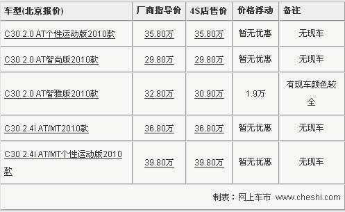 沃爾沃旗下的豪華轎跑車全新改款C30已于3月18日正式在中國上市,憑借著時(shí)尚的外觀設(shè)計(jì)和沃爾沃的品牌影響力,自上市以來受到了廣泛關(guān)注。近日網(wǎng)上車市記者也從沃爾沃北京經(jīng)銷商處了解到,目前C30最高優(yōu)惠1.9萬元,詳情參考下表: