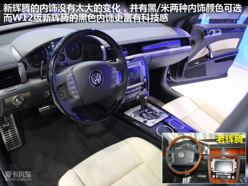 與它經(jīng)過少許修改的外觀不同,新輝騰的內(nèi)飾幾乎沒有變化,整車主要有兩種配色:原木色+米色與黑+銀色可選。車內(nèi)的設(shè)計、布局與老款車型完全相同,新輝騰W12版車型采用黑銀色內(nèi)飾+米色座椅,與典雅的V8車型所采用的原木色相比更富有冷冷的科技感。