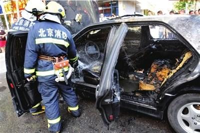 昨天下午4點(diǎn)10分,出事車輛斜停在輔路上,消防員正在車體起火處噴水。約15分鐘后,滅火完畢,車前蓋內(nèi)的配件已是一片漆黑,消防員打開車門查看時(shí),發(fā)現(xiàn)車內(nèi)坐墊等物已被燒焦。
