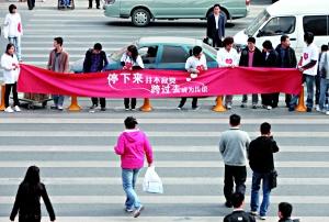 “停下來(lái)并不寂寞,跨過(guò)去成為傳說(shuō)!弊蛉(27日)上午,中關(guān)村海龍大廈前面的丁字路口,十余名年輕人手持橫幅,在人行道上站成三排,組成“人肉斑馬線(xiàn)”,陪行人一起等紅燈。活動(dòng)的發(fā)起者表示,大家通過(guò)網(wǎng)絡(luò)召集,旨在用這種類(lèi)似行為藝術(shù)的方式,提示人們珍愛(ài)生命,勿闖紅燈。