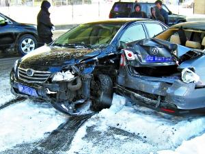 在距離事發(fā)地點(diǎn)不到5米的一家汽車銷售店上班的閻先生稱,事發(fā)時(shí)外面很安靜,他和店里的同事接連聽見兩下撞擊聲,出門就看到慘劇發(fā)生。豐田車的左前側(cè)受損嚴(yán)重,前輪搖搖欲墜。而速騰車和廣本車的車尾部被撞嚴(yán)重,完全癟了進(jìn)去,其中速騰車后備箱里的備胎還被撞了出來(lái)!罢厥仑S田車?yán)镉?人,司機(jī)下車后還是鎮(zhèn)定地安撫乘客。”閻先生說(shuō),被撞的男子趴在雪地里,頭上滿是鮮血。隨后999趕到,據(jù)急救人員稱,剛開始男子還有呼吸,但2分鐘之后,男子死亡。