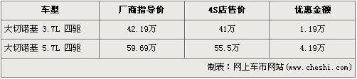 據(jù)經(jīng)銷(xiāo)商銷(xiāo)售人員介紹,目前Jeep大切諾基全系最高優(yōu)惠4.19萬(wàn)元。大切諾基共分為3.7和5.7兩個(gè)排量,3.7L車(chē)型經(jīng)1.19萬(wàn)元的優(yōu)惠后,售價(jià)從42.19萬(wàn)元下降到了41萬(wàn)元;而排量更大的5.7L車(chē)型經(jīng)4.19萬(wàn)優(yōu)惠后,售價(jià)從56.69萬(wàn)元下降到了55.5萬(wàn)元。