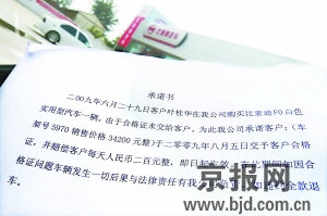 上午10時許,記者來到了位于豐臺區(qū)花鄉(xiāng)羊坊930號的金博藍汽車銷售服務公司,新車停車場里和展示廳內(nèi)只有4輛新車待售,偶爾還有人在看車試車。買了車卻拿不到合格證的車主陸續(xù)來到4S店,他們手中都拿著一份“承諾書”,其中承諾8月5日交付合格證,并賠償一定金額,如果違約則全款退車。