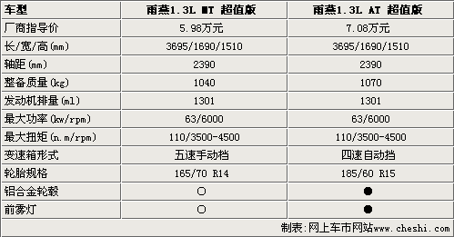 從圖表中可以看到,雨燕的兩款超值版價(jià)格相差1.1萬元,在性能和配置方面都有一些不同之處。首先,雨燕超值版的車身尺寸和軸距都沒有任何變化,但自動(dòng)擋車型的整備質(zhì)量比手動(dòng)重30kg。另外,在動(dòng)力搭配相同的情況下,雨燕1.3L AT超值版匹配四速自動(dòng)變速箱,所以加速和高速行駛的表現(xiàn)不會(huì)超過手動(dòng)擋車型。不過雨燕1.3L AT 超值型采用了15寸輪胎和鋁合金輪轂,而且還配備了手動(dòng)擋所沒有的前霧燈,其他配置方面并無差異。