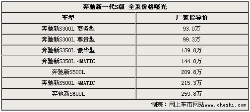 奔馳新一代S級(jí)轎車將于今晚在太廟正式上市,首推S300L商務(wù)型、S300L尊貴型、S350L豪華型、S350L 4MATIC、S500L、S500L 4MATIC和S600L共計(jì)7款車型,售價(jià)為93萬元-259.8萬元。而在上海車展全球首發(fā)的奔馳新S400L 混合動(dòng)力車型,未在本次上市車型中出現(xiàn)。具體車型及售價(jià)如下表所示: