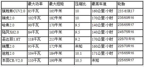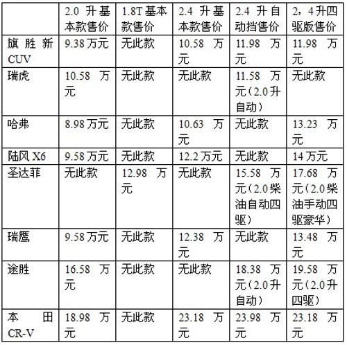 我們從廠家了解到,新旗勝已經(jīng)全面上市,動(dòng)力分為2.0升和2.4升兩個(gè)系列,分為兩驅(qū)和四驅(qū)共6個(gè)車型。外形看,這是一款頗為漂亮的車子,外形、做工和配置,與其售價(jià)很是不符。為了讓大家對(duì)其有所了解,這里把新旗勝和同級(jí)的幾款自主品牌SUV以及小一個(gè)級(jí)的SUV(比如瑞虎)做一番簡(jiǎn)單對(duì)比。為了參考的更全面,還把包括本田CR-V在內(nèi)的幾款合資車同時(shí)排列,盡管它們所面對(duì)的,并非同一個(gè)市場(chǎng),特別是像本田這樣的車型,與自主品牌相比,品牌價(jià)值差異較大,不能做直接對(duì)比,只能是個(gè)參考。