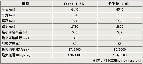 豐田Verso與卡羅拉雖然采用了同一技術(shù)平臺,但是由于這兩款車的類型不同,因此在車身尺寸方面也存在著較大的差異。豐田Verso雖然在車長方面遜于卡羅拉,但是在車寬、車高及軸距方面,這款MPV車型還是占據(jù)著明顯的優(yōu)勢。另外,這兩款車雖然均采用1.6L發(fā)動機(jī),但是由于調(diào)校的不同,豐田Verso在動力上要優(yōu)于卡羅拉。