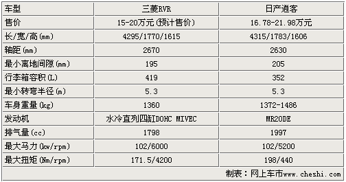 三菱RVR長寬高分別為4295/1770/1615,軸距為2670mm,與競爭車型逍客相比,車長還要略小一些,而軸距上稍具優(yōu)勢,離地間隙也比較接近,三菱RVR為195mm、逍客為205mm。而在動力上RVR搭載的是4B10 1.8L發(fā)動機,最大功率102kw/rpm,而最大扭矩為171.5牛米。